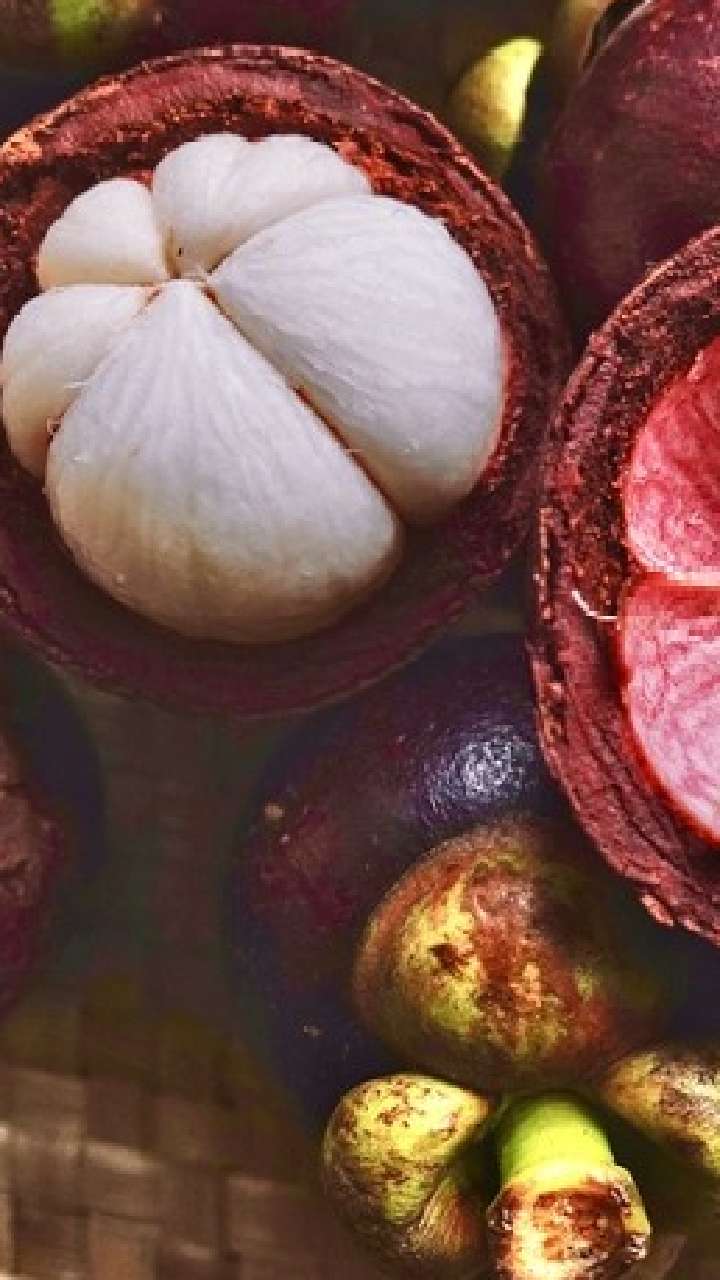 Mangosteen has a thick purple skin with juicy white flesh inside. It tastes sweet and a little tangy, like a mix of peach and pineapple.