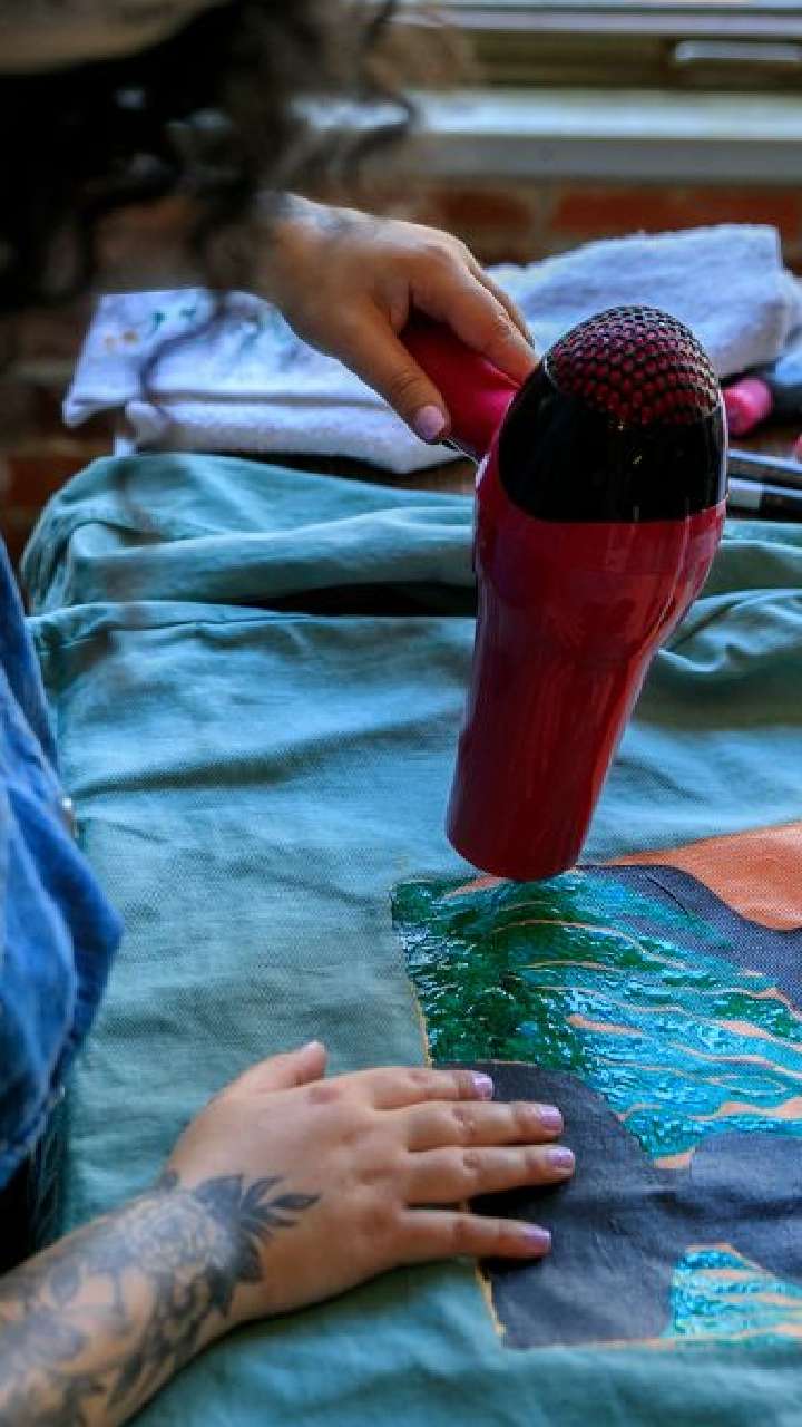 In this a person paints the cardboard sheets to see how long new paint mixes take to dry and to see if the color and texture changes.