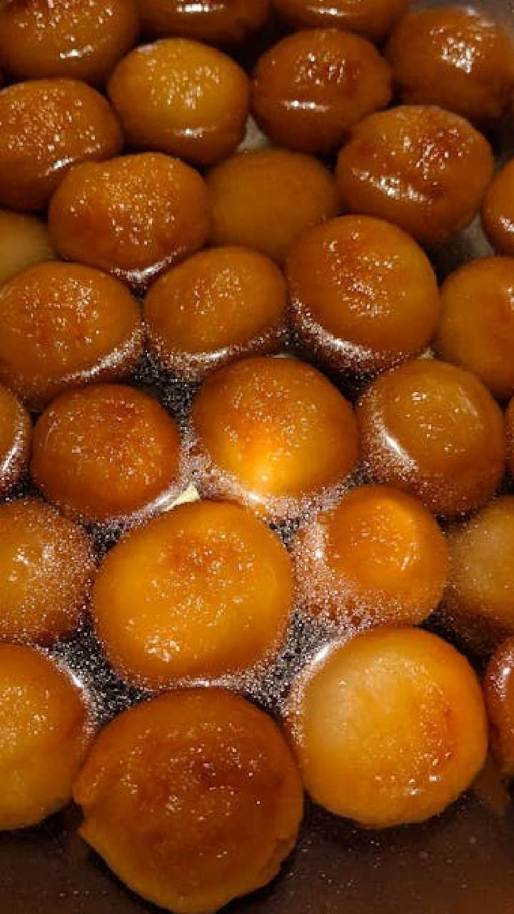 Some people call it fried dough balls in sugar syrup. It is fried until golden brown and then soaked in syrup.