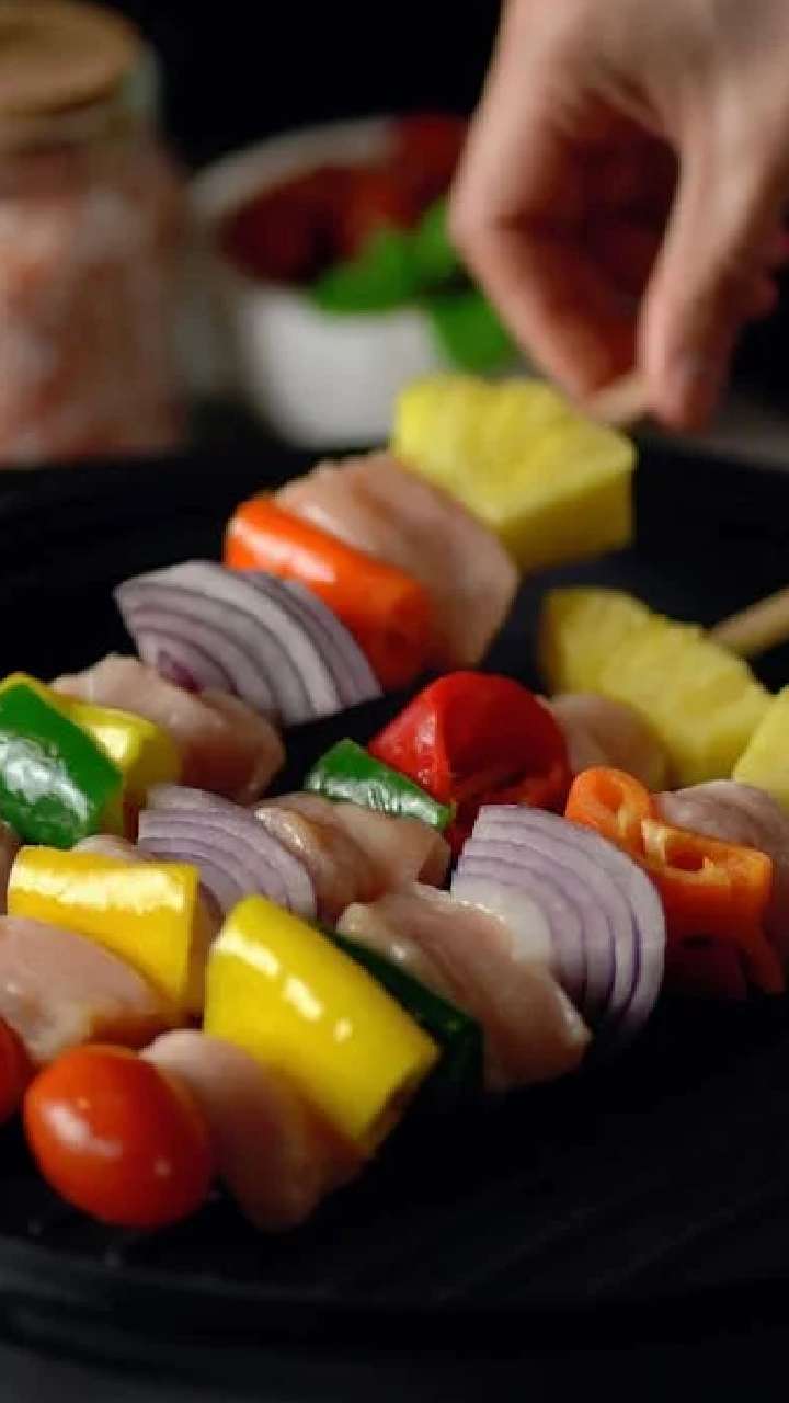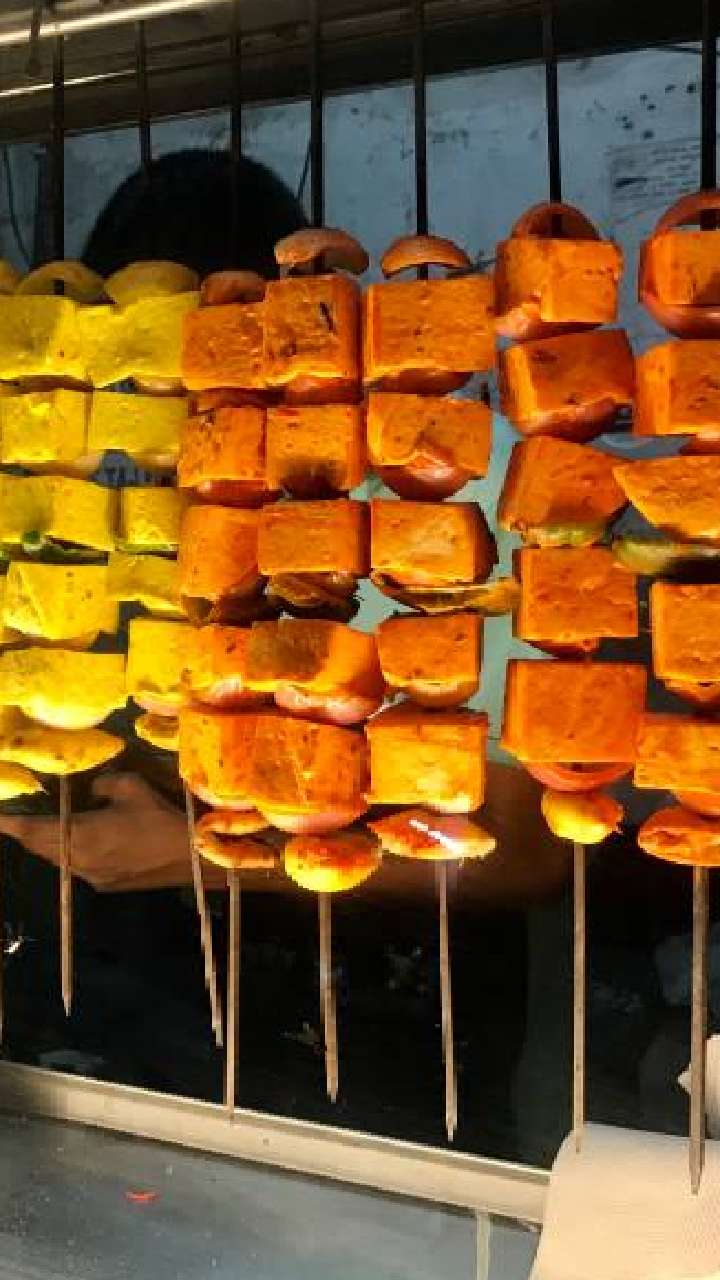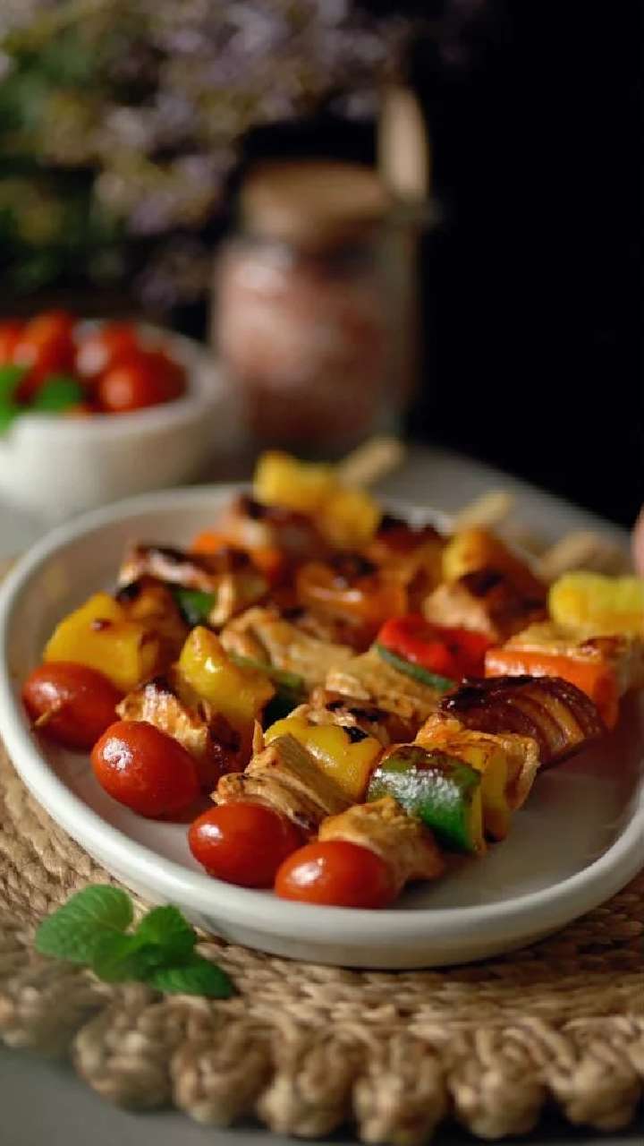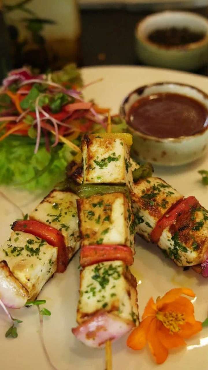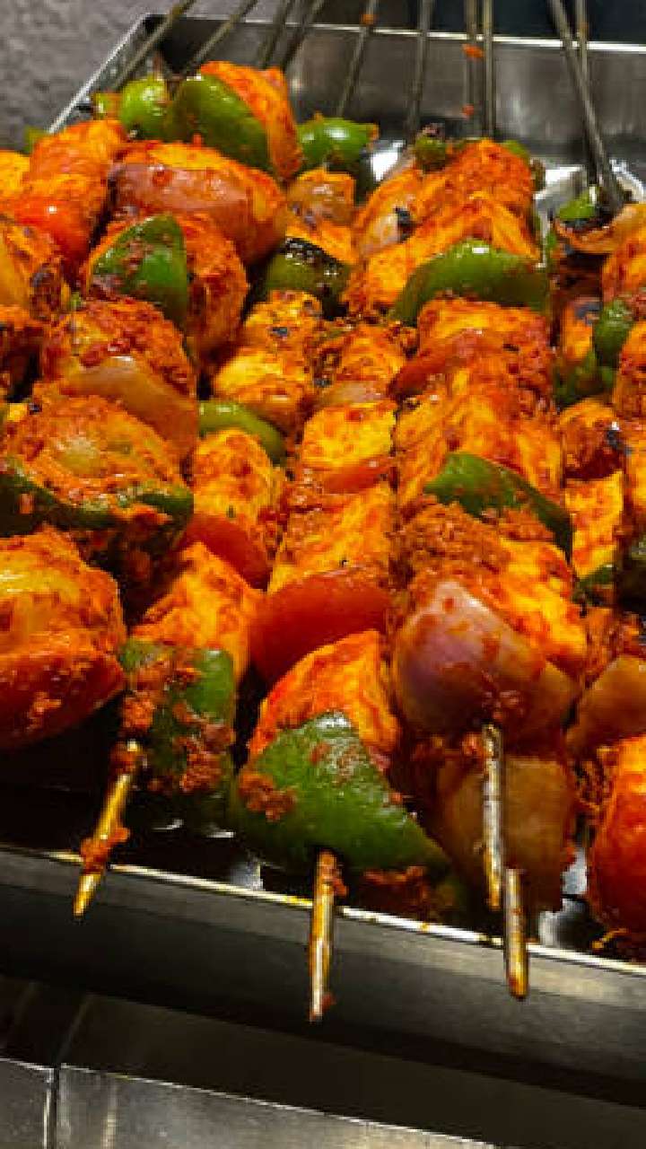 The marinated paneer is skewered with vegetables like onions, bell peppers, and tomatoes. These vegetables add color, texture, and balance to the dish.