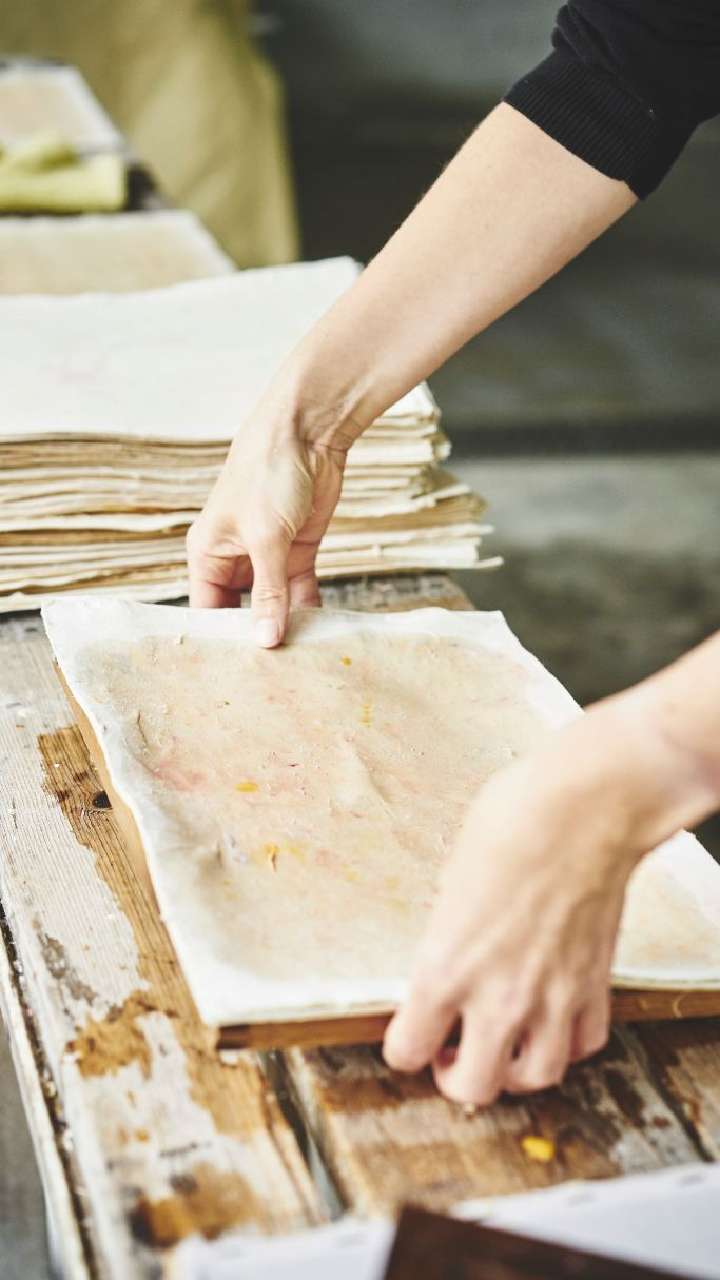 उत्पादन प्रक्रिया में रेशेदार बनाने के लिए चीथड़ों को भिगोना और पीटना शामिल था। जिससे एक कागज को बनाने की प्रक्रिया आगे बढ़ाई जा सकती थी।