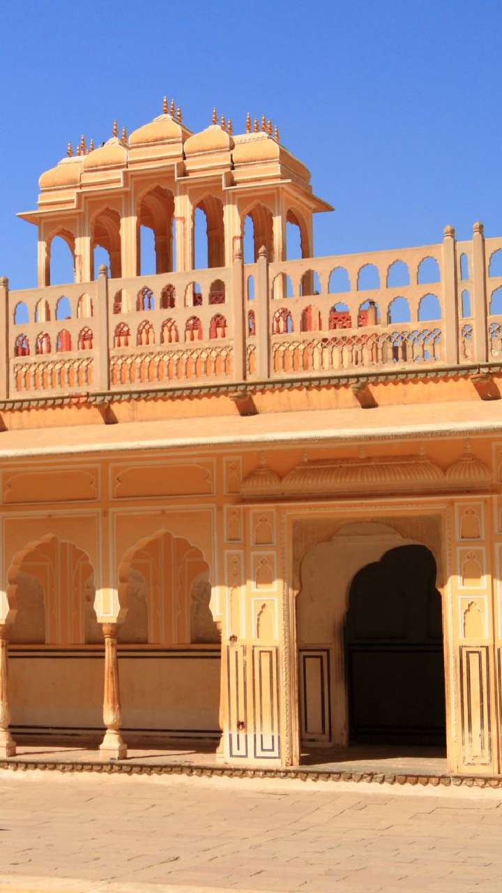 यह लाल और गुलाबी बलुआ पत्थर से बना है, जो जयपुर की पारंपरिक वास्तुकला को दर्शाता है।